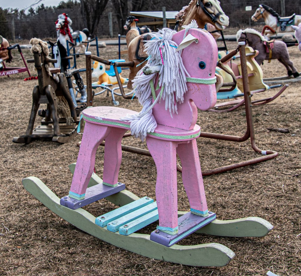 But, dad jokes aside, not all of the ponies are your standard rocking horses and pony toys. Some of the ponies had garland, cat ears and other props on them. I especially like the doll that children (or adults) can use to play with on the horse.